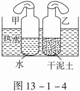 3. 近年来,我国在持续推进海绵城市的建设,使城市既有“面子”更有“里子”。为了比较水和干泥土的比热容,小明做了如下实验:在两个相同的塑料瓶甲和乙内分别装入室温下的水和干泥土,在瓶口扎上气球,将它们一同浸入热水中,装置如图13-1-4所示。