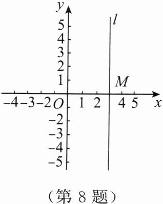 8. 如图,在平面直角坐标系中,直线 $l$ 过点 $M(3,0)$,且平行于 $y$ 轴。如果 $\triangle ABC$ 的三个顶点分别是 $A(-2,0)$,$B(-1,0)$,$C(-1,2)$,$\triangle ABC$ 关于 $y$ 轴对称的图形是 $\triangle A_1B_1C_1$,$\triangle A_1B_1C_1$ 关于直线 $l$ 对称的图形是 $\triangle A_2B_2C_2$,求 $\triangle A_2B_2C_2$ 三个顶点的坐标。