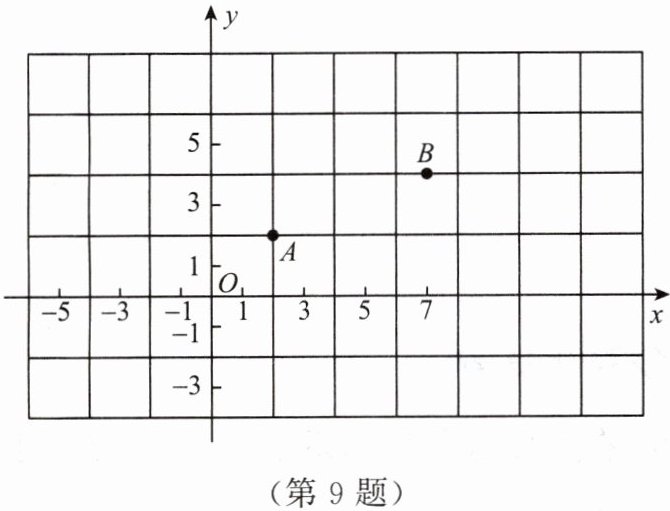 9. 如图,已知 $A$,$B$ 两村庄的坐标分别为 $(2,2)$,$(7,4)$,一辆汽车从原点 $O$ 出发在 $x$ 轴上行驶。