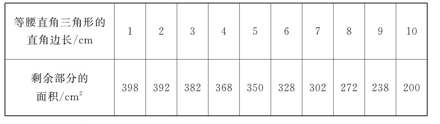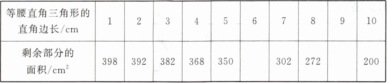 8. 在边长为$20\ cm$的正方形四个角上,分别剪去大小相等的等腰直角三角形,当等腰直角三角形的直角边长由小变大时,剩余部分的面积也随之发生变化,它们的变化情况如下表: