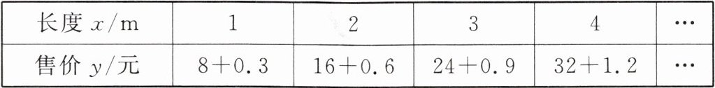 1. 百货大楼进了一批花布,出售时要在进价的基础上加收一定的利润,其长度$x(m)与售价y$(元)的部分对应关系如下表所示,下列用长度$x表示售价y$的关系式中,正确的是(
