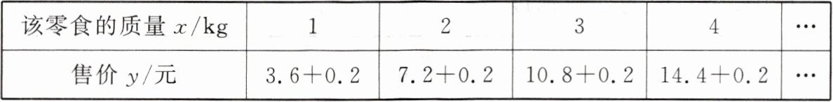 (2)根据题意得3.6×7+0.2=25.2+0.2=25.4(元),所以出售7 kg该零食时的售价为25.4元。