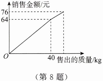 8. 小李以$0.8元/kg$的价格从批发市场购进若干千克西瓜到市场去销售,在销售了$40kg$后,余下的每千克降价$0.4$元,全部售完。已知销售金额与售出的质量之间的关系如图所示,则小李一共赚了