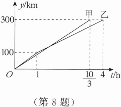 8. $A$,$B两地相距300km$,甲、乙两车同时从$A地出发前往B$地,如图所示的是甲、乙两车行驶路程$y(km)随行驶时间t(h)$变化的图象,结合图象信息,回答下列问题: