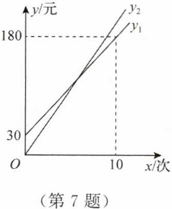 设某学生暑期健身$x$(次),按照方案一所需费用为$y_1$(元),且$y_1 = k_1x + b$;按照方案二所需费用为$y_2$(元),且$y_2 = k_2x$。其函数图象如图所示。