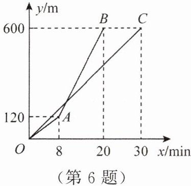 6. 甲、乙两人沿同一路线登山,图中线段 $ OC $、折线 $ OAB $ 分别是甲、乙两人登山的路程 $ y $(m)与登山时间 $ x $(min)之间的函数图象。请根据图象所提供的信息,解答如下问题: