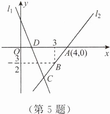 5. 如图,直线 $ l_1 $ 的表达式为 $ y = - 3x + 3 $,且 $ l_1 $ 与 $ x $ 轴交于点 $ D $,直线 $ l_2 $ 经过点 $ A,B $,直线 $ l_1,l_2 $ 交于点 $ C $,则点 $ C $ 的坐标是