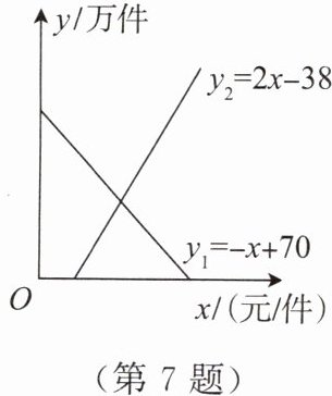 7. 如图,某地区对某种药品的需求量 $ y_1 $(万件)、供应量 $ y_2 $(万件)与价格 $ x $(元/件)分别近似满足下列函数关系式: $ y_1 = - x + 70,y_2 = 2x - 38 $。当需求量为 $ 0 $ 时,即停止供应。当 $ y_1 = y_2 $ 时,该药品的价格称为稳定价格,需求量称为稳定需求量。