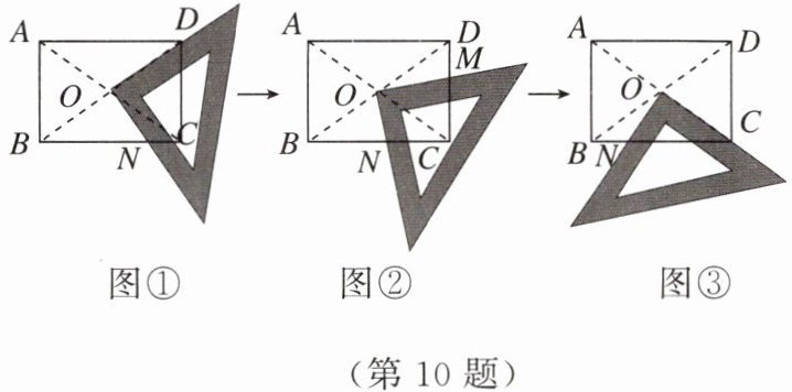 10. 某研究性学习小组开展了一次课外活动,将一块直角三角尺的直角顶点绕着矩形 $ABCD(AB < BC)$ 的对角线交点 $O$ 旋转(如图①→图②→图③),图中 $M$,$N$ 分别为直角三角尺的直角边与矩形 $ABCD$ 的边 $CD$,$BC$ 的交点。
