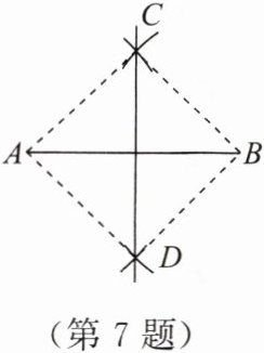 7. 如图,小聪在作线段 $AB$ 的垂直平分线时,他是这样操作的:分别以点 $A$,$B$ 为圆心,大于 $\frac{1}{2}AB$ 的长为半径画弧,两弧相交于点 $C$,$D$,则直线 $CD$ 即为所求. 根据他的作图方法可知四边形 $ADBC$ 一定是