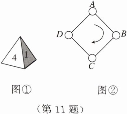 如图②,正方形 $ ABCD $ 的四个顶点处各有一个圈。跳圈游戏的规则:游戏者每掷一次骰子,骰子着地一面上的数字是几,就沿正方形的边顺时针方向连续跳几个边长。