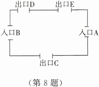 8. 某奥体中心的示意图如图所示,其东、西面各有一个入口 $ A $,$ B $,南面为出口 $ C $,北面分别有两个出口 $ D $,$ E $。聪聪若任选一个入口进入,再任选一个出口离开,那么他从入口 $ A $ 进入并从北面出口离开的概率为(