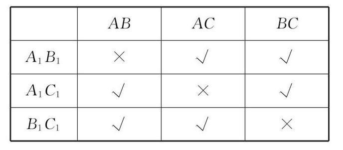 (2)小明先从左端 $ A $,$ B $,$ C $ 三个绳头中随机选两个打一个结,再从右端 $ A_{1} $,$ B_{1} $,$ C_{1} $ 三个绳头中随机选两个打一个结,求这三根绳子能连接成一根长绳的概率。
