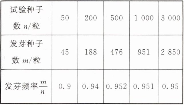 5. 在同样的条件下对某种小麦种子进行发芽试验。统计发芽种子数,获得如下频数表。由表估计该麦种的发芽概率是(