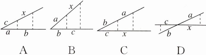 9. 已知三条线段的长分别为$a$,$b$,$c$,求作一条长为$x的线段使ax = bc$,以下作法正确的是(每个图中的两条虚线都是平行线)(
