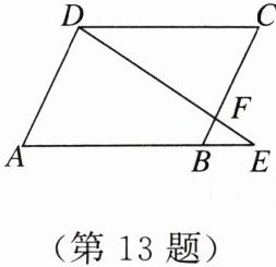 13. 如图,点$E是□ ABCD的边AB$延长线上的一点,$DE交BC于点F$,$\frac{BE}{AB} = \frac{1}{3}$,$EF = 2$,$BF = 1.5$,求$DF$,$BC$的长。
