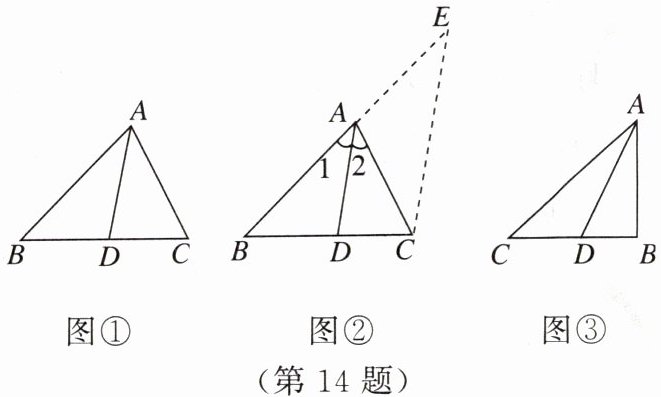 角平分线分线段成比例定理,如图①,在$\triangle ABC$中,$AD平分\angle BAC$,则$\frac{AB}{AC} = \frac{BD}{CD}$。下面是这个定理的部分证明过程。