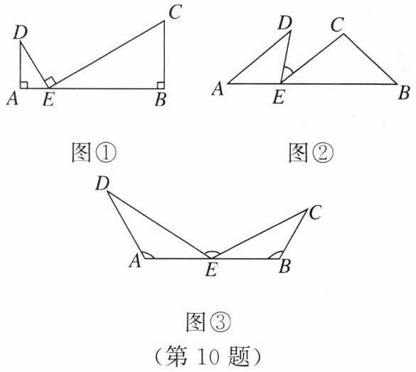 10. (1)尝试:如图①,已知$A$,$E$,$B$三点在同一直线上,且$\angle A = \angle B = \angle DEC = 90^{\circ}$.