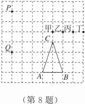 8. 如图,若 A,B,C,P,Q,甲、乙、丙、丁都是方格纸的格点,为使△ABC∽△PQR,则点 R 应是甲、乙、丙、丁点中的