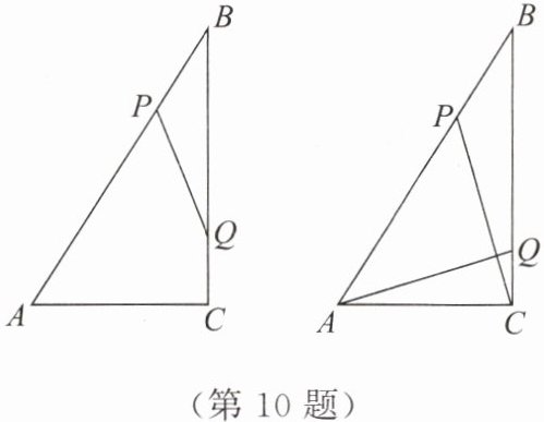 10. 如图,在$Rt\triangle ABC$中,$\angle ACB = 90^{\circ}$,$AC = 6\ cm$,$BC = 8\ cm$,动点$P从点B$出发,在$BA边上以5\ cm/s的速度向点A$匀速运动,同时动点$Q从点C$出发,在$CB边上以4\ cm/s的速度向点B$匀速运动,运动时间为$t\ s(0 < t < 2)$,连接$PQ$.