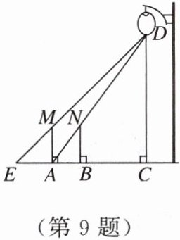 9. 一天晚上,李明和张龙利用灯光下的影子长来测量一路灯 $D$ 的高度. 如图,当李明走到点 $A$ 处时,张龙测得李明直立身高 $AM$ 与其影子长 $AE$ 正好相等,接着李明沿 $AC$ 方向继续向前走,走到点 $B$ 处时,李明直立身高 $BN$ 的影子恰好是线段 $AB$,并测得 $AB = 1.25$ m. 已知李明直立时的身高为 $1.75$ m,求路灯 $D$ 的高度.(结果精确到 $0.1$ m)