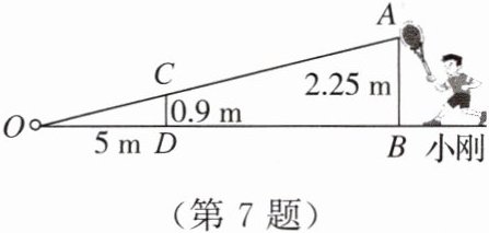 7. 如图,小刚在打网球时,为使球恰好能过网(网高为 $0.9$ m),且落在对方区域离网 $5$ m 的位置上. 已知他击球的高度是 $2.25$ m,则他应站在离网的(