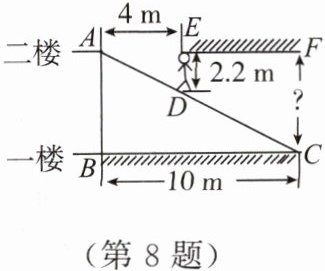 8. 如图,某超市在一楼至二楼之间安装有电梯,天花板与地面平行,张强扛着箱子(人与箱子的总高度约为 $2.2$ m)乘电梯刚好安全通过,则两层楼之间的高约为