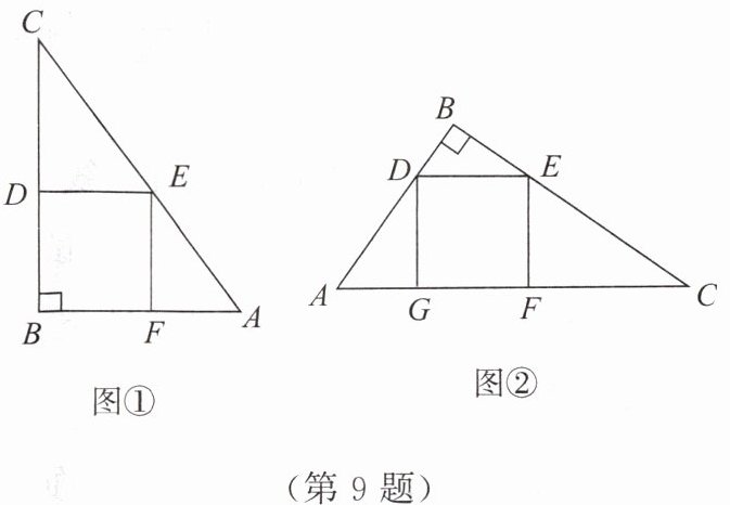 9. 一块直角三角形木板的一条直角边 $AB$ 长为 $1.5$ m,面积为 $1.5$ $m^{2}$,工人师傅要把它加工成一个面积最大的正方形桌面,请甲、乙两位同学设计加工方案,如图①所示的是甲同学的设计方案,如图②所示的是乙同学的设计方案. 你认为哪位同学设计的方案较好?判断并说明理由. (加工损耗忽略不计,计算结果可保留分数)