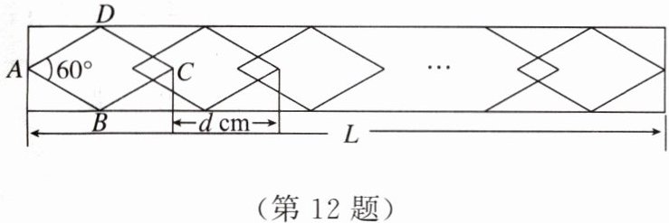 12. 如图,学校沿路护栏的纹饰部分设计成若干个全等菱形组合图案,每增加一个菱形图案,纹饰长度就增加$d\mathrm{cm}$. 已知菱形$ABCD的边长为10\sqrt{3}\mathrm{cm}$,其中一个内角为$60^{\circ }$.