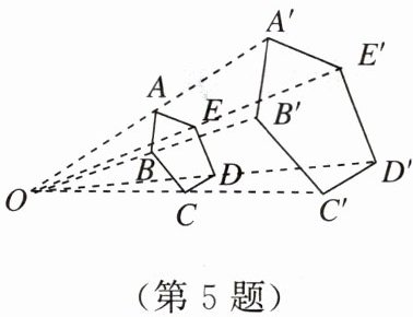 5. 如图,以点$O$为位似中心,将五边形$ABCDE放大后得到五边形A'B'C'D'E'$。已知$OA = 10\mathrm{cm}$,$OA' = 20\mathrm{cm}$,则五边形$ABCDE的周长与五边形A'B'C'D'E'$的周长比值是