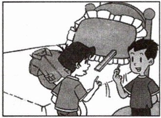 同学们,图画中有哪些我们学过的物品?这两个男孩在谈论什么呢?请结合本单元所学内容,为他们编写一段英文对话。