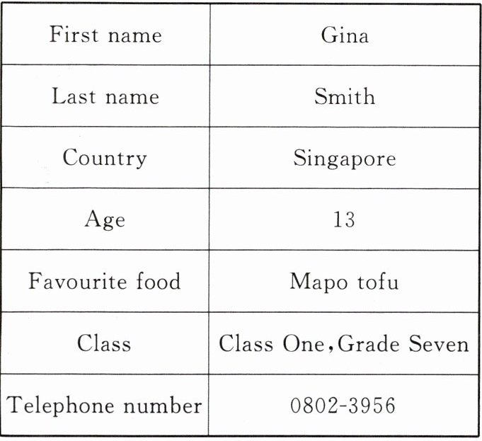 Hello! My name is Gina Smith. Gina is my first name and Smith is my last name. I'm from Singapore, but now I live in China with my family. I'm 13 years old. I'm in Class One, Grade Seven. I like Chinese food a lot. My favourite food is Mapo tofu. My telephone number is 0802-3956. Do you want to be my friend?