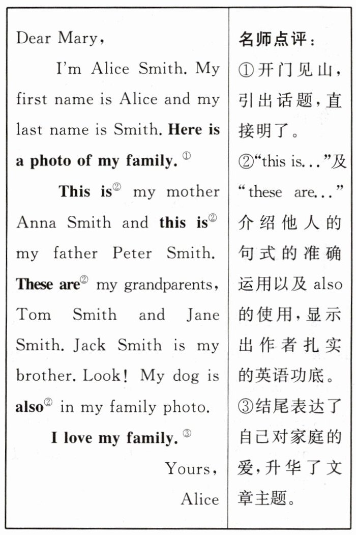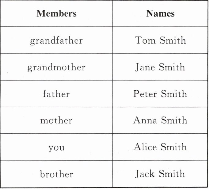 假如你叫爱丽丝·史密斯(Alice Smith),你的笔友玛丽(Mary)想了解你的家庭情况,你打算给她寄一张你的全家福,介绍一下你的家庭成员。