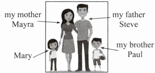 Here is a photo of my family. This is my father,Steve. He often plays basketball with me. My mother,Mayra,is on the left. She is beautiful and kind. She always reads me a story at night. This is my brother Paul. He's six years old. He really likes sports. The girl is me. I love my family.