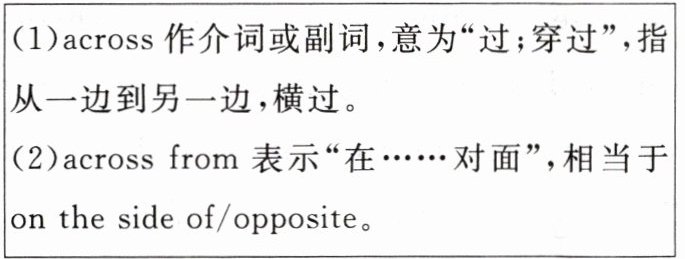 * It is across from the school hall. 它在学校礼堂的对面。(教材·P36)