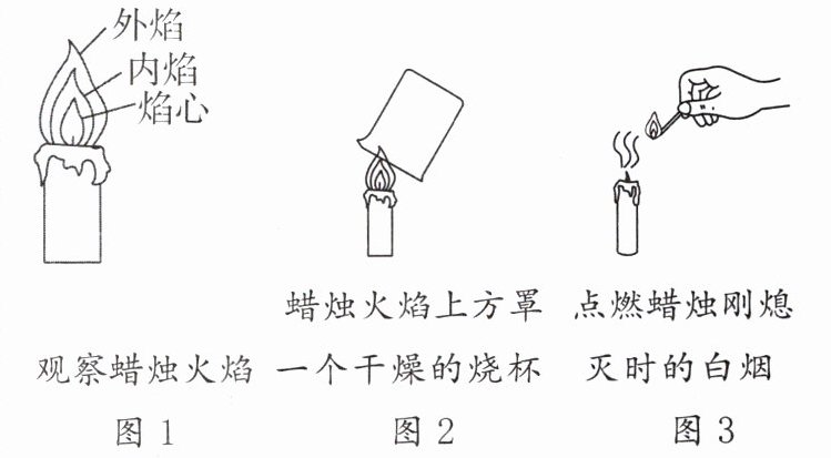 温度最低。③探究生成物:用一个干燥的烧杯罩在蜡烛火焰的上方,烧杯内壁很快形成一层水雾,说明蜡烛燃烧有