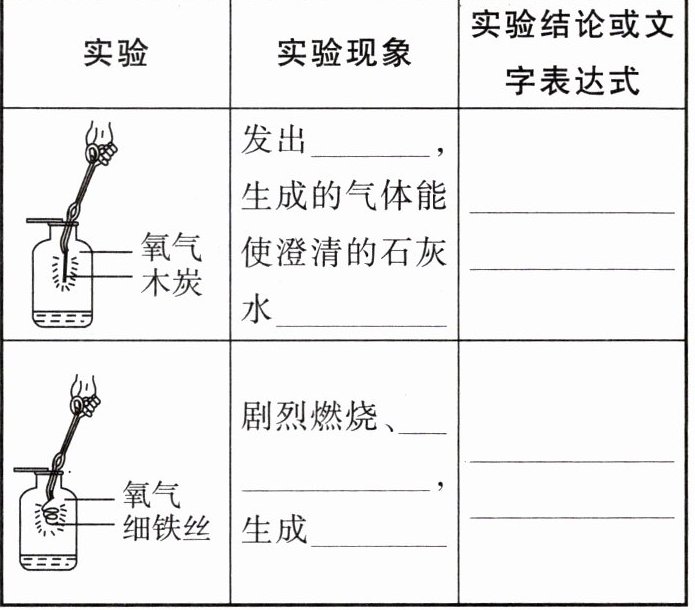 白光 变浑浊 碳+氧气$\xrightarrow{点燃}$二氧化碳 火星四射 黑色固体 铁+氧气$\xrightarrow{点燃}$四氧化三铁