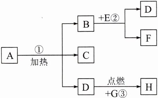 13. (16分)A~H八种物质,有如图所示关系:其中A是一种暗紫色固体,B、G都是黑色固体,D能使带火星的木条复燃,E、F都是无色液体,H是一种能使澄清石灰水变浑浊的气体,在②的反应前后B的质量和化学性质都不改变。