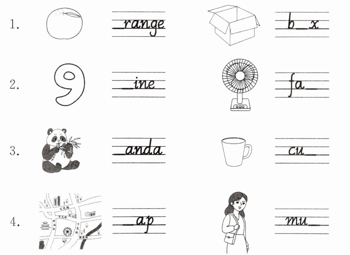 1. orange; box 2. nine; fan 3. panda; cup 4. map; mum