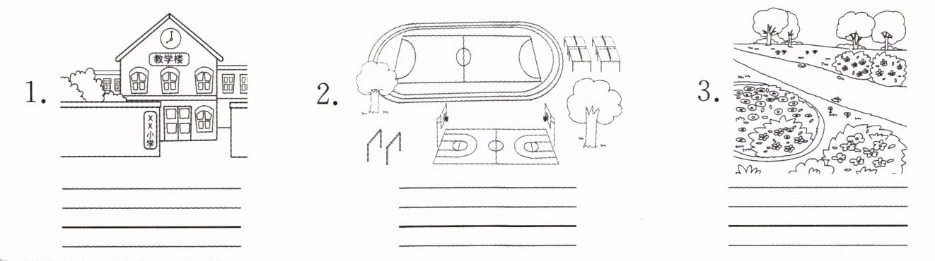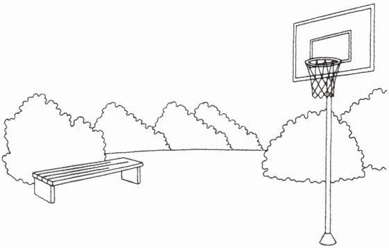 在篮球架下方的地面上画一个打篮球的男孩;在长椅上画一个书包;在长椅附近画一只可爱的狗。