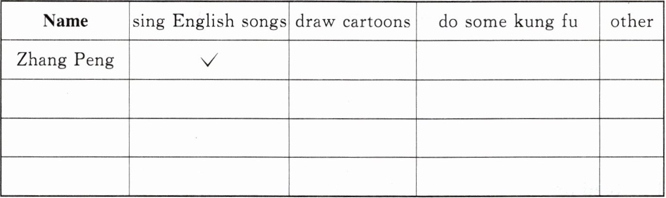 | Name | sing English songs | draw cartoons | do some kung fu | other |