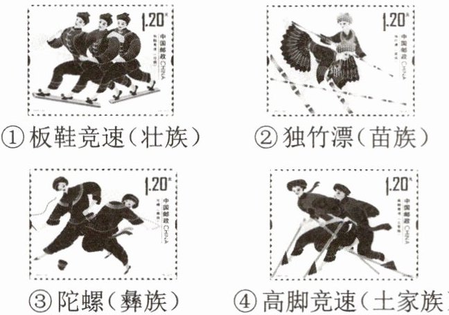 第十二届全国少数民族传统体育运动会于 2024 年 11 月 22—30 日在海南三亚举办,多项民族传统体育项目在本次大会中呈现。下面是少数民族运动会纪念邮票。读图,回答 7~8 题。