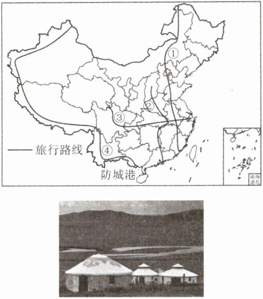 9. 众多的旅客游遍大江南北,感受我国各少数民族的民俗风情,在网络上分享精彩的游记。下图是一位旅客的旅行路线图。读图,回答下列问题。