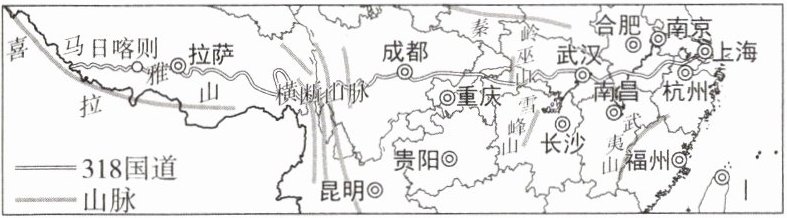 318国道是我国著名的景观大道,沿途风光各异,串联起城市和乡村,呈现一幅幅美丽的画卷。读318国道沿线图,完成6~7题。