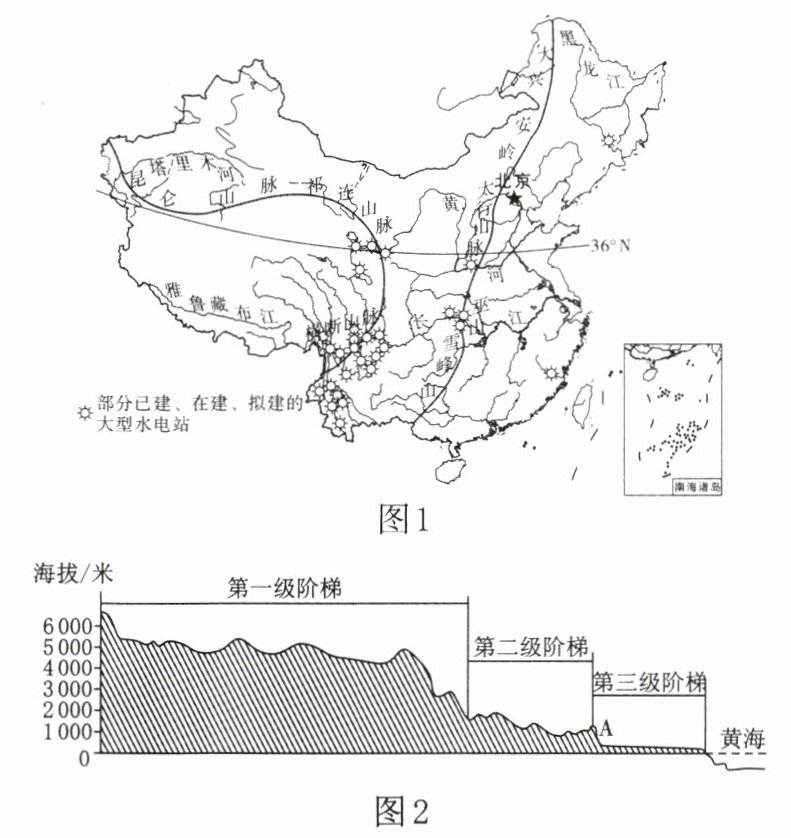 图1为我国地势三级阶梯及主要大型水电站分布示意图,图2为我国沿36°N附近地形剖面示意图。