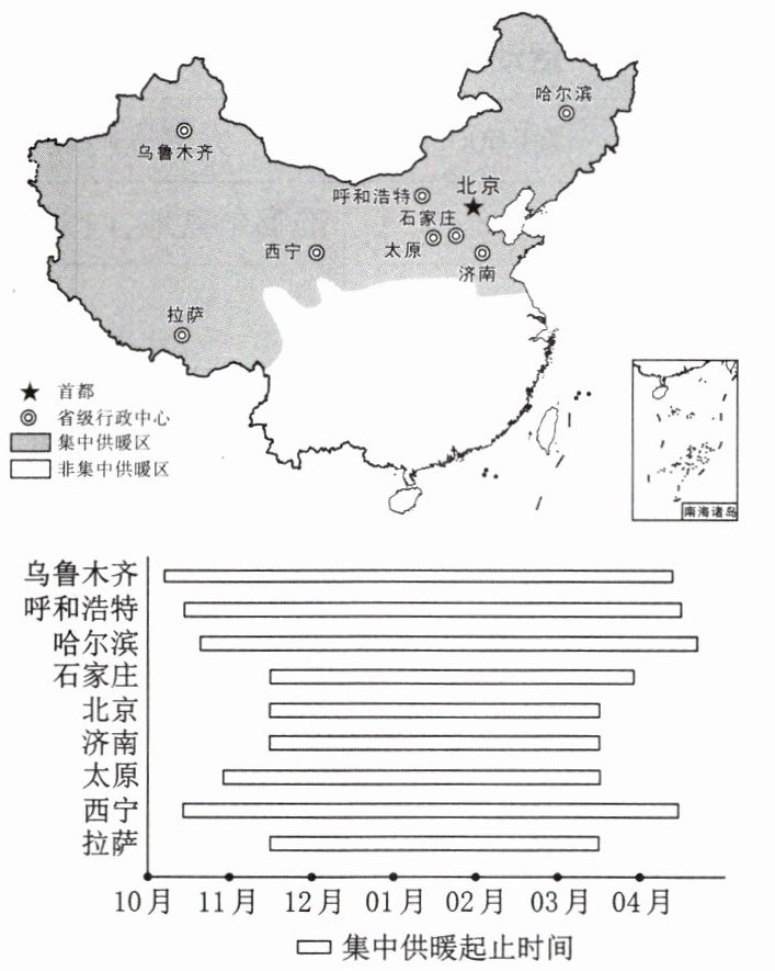 集中供暖是指向建筑物供给热量,保持室内舒适温度的社会服务。下图示意我国集中供暖区分布及部分城市集中供暖起止时间。据此完成8~9题。