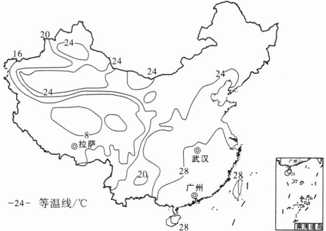 我国7月普遍高温且南北温差较小。如图为我国7月平均气温等温线分布图。读图,回答6~7题。