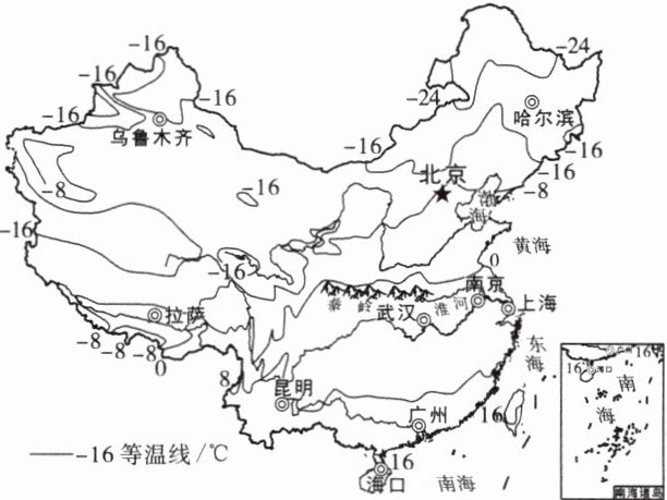 我国1月气温自南向北显著递减。如图为中国1月平均气温分布图。读图,回答3~5题。