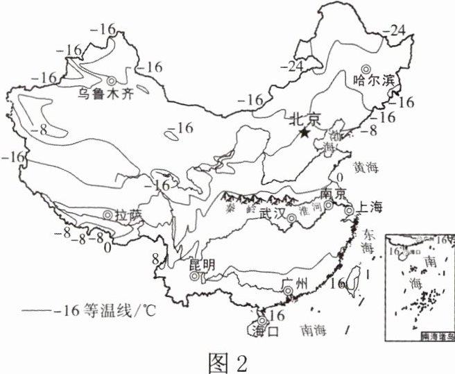 13. 我国冬季南北温差大,入冬时间差异明显。下面为我国常年平均入冬时间分布图(图1)和1月平均气温分布图(图2)。读图,回答下列问题。