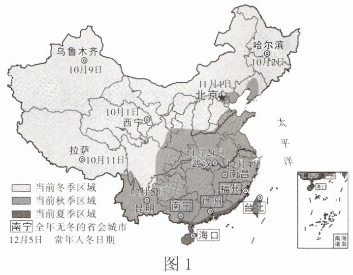 区域”。(2) 我国东部各地入冬时间分布规律为自